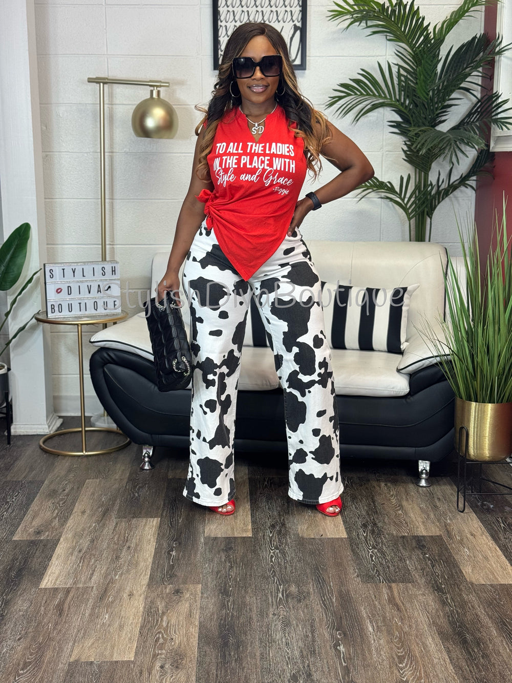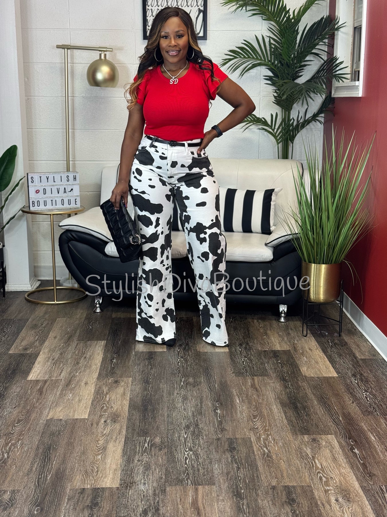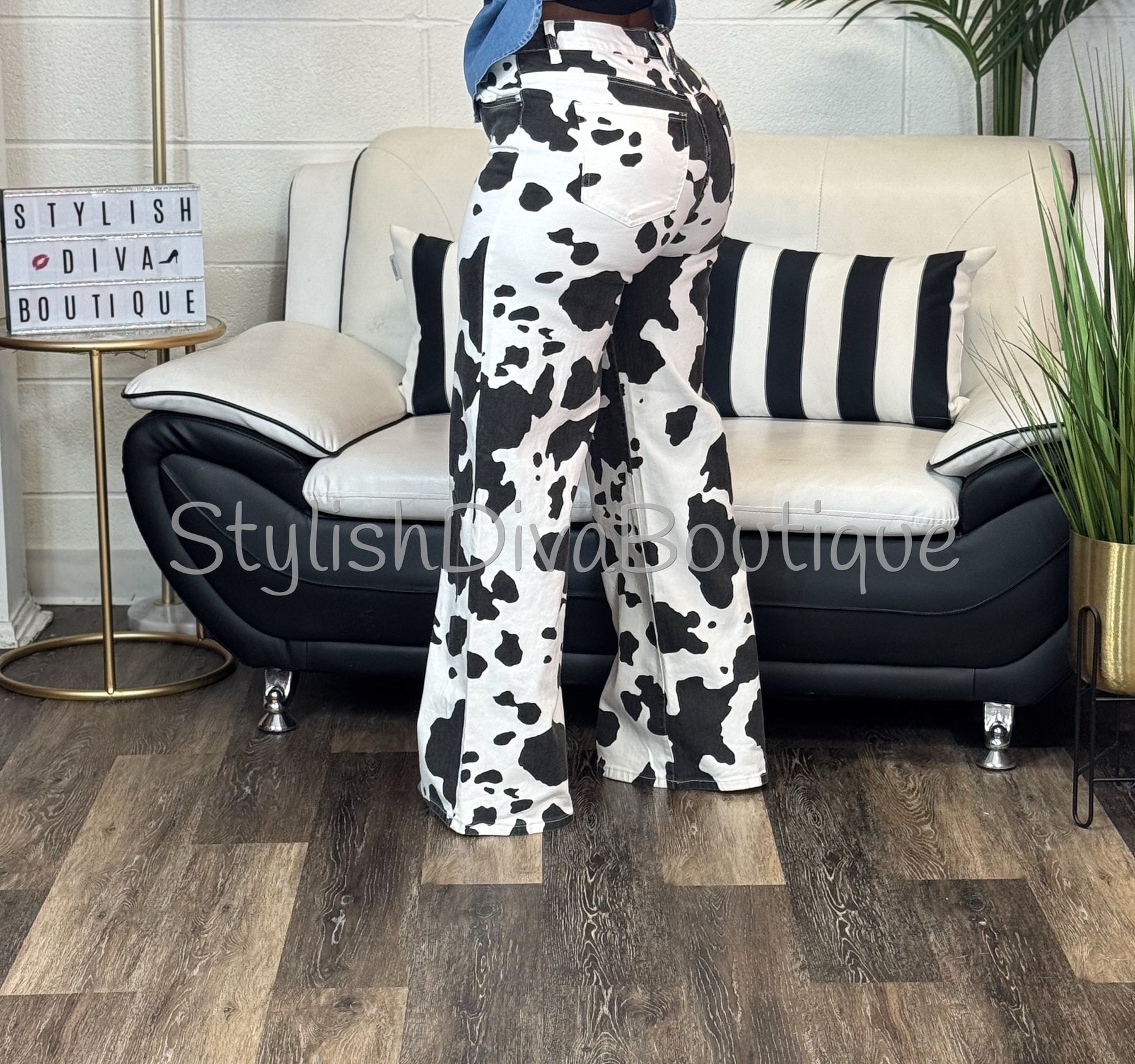The Midnight Rodeo Statement Jeans feature a bold black and white cow print paired with a flattering high-rise, wide-leg silhouette that elongates your legs and elevates your entire look.