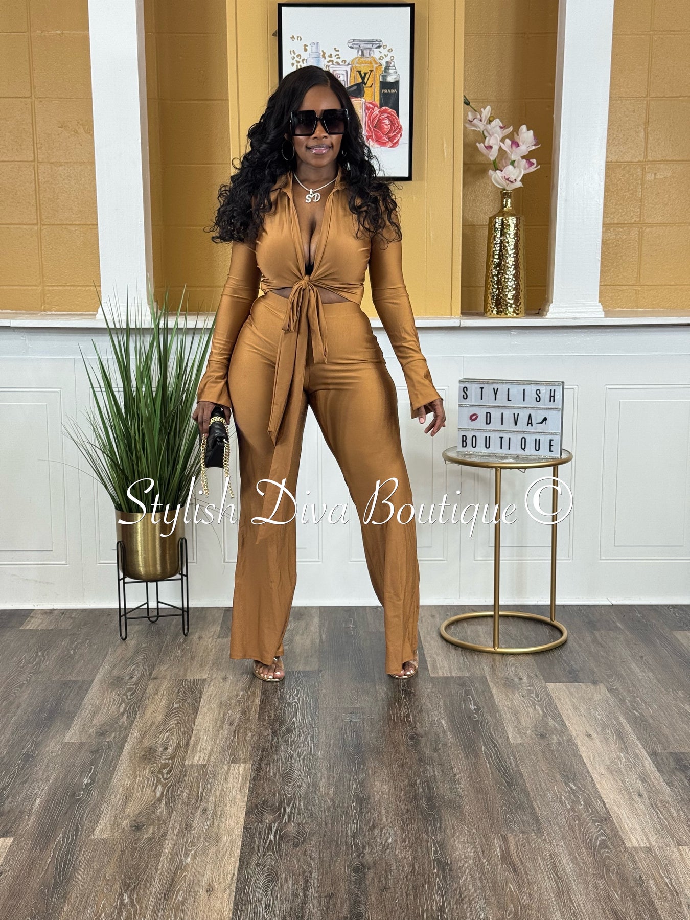 LONG SLEEVE CROP TOP WITH TIE 2 PIECE PANTS SET
