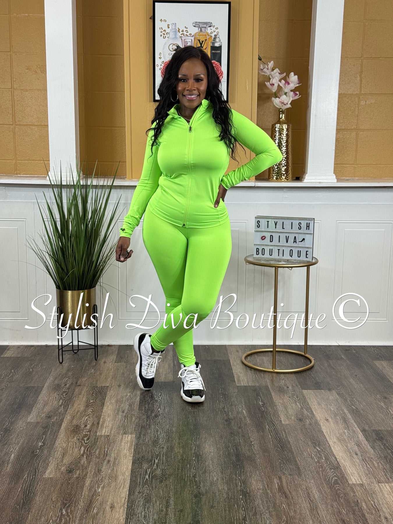 Elevate your workout wardrobe with the Flex Appeal Active Set in Neon Lime. This vibrant two-piece features a lightweight jacket with a short collar, front zipper closure, and convenient back zippered pocket. Long sleeves with thumb holes add extra comfort and style. The matching leggings offer a mid-waist, full-length skinny fit that moves with you, crafted from stretchy 85% polyester and 15% spandex. Designed for performance and fit—size up if between sizes for the perfect silhouette. Stay confident and comfortable from warm-up to cool-down in this dynamic set.